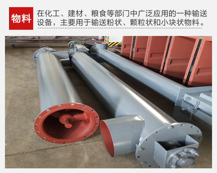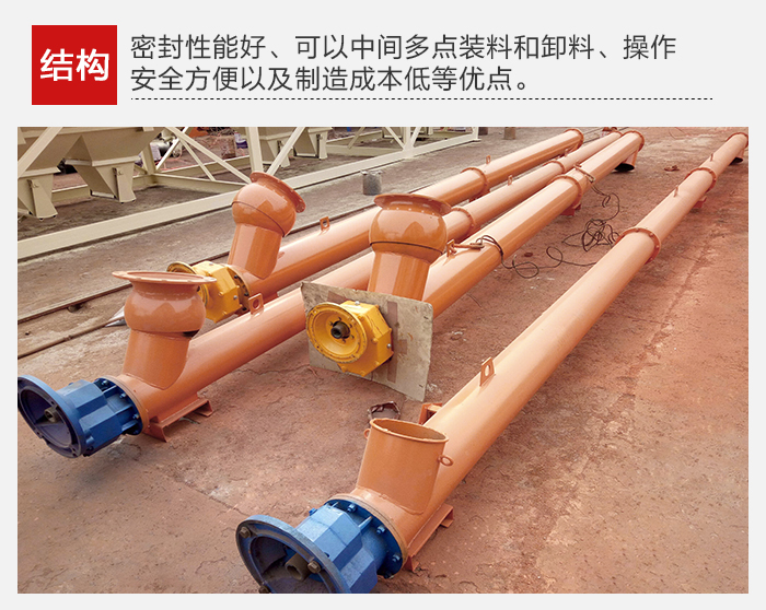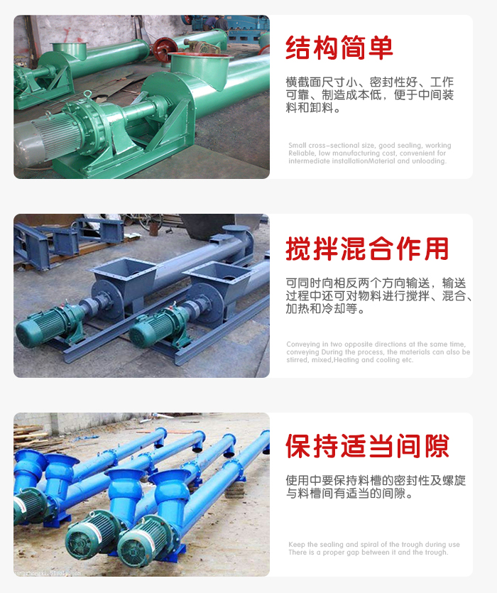 结构简单、横截面尺寸小、密封性好、工作可靠、制造成本低,便于中间装料和卸料,输送方向可逆向,也可同时向相反两个方向输送。输送过程中还可对物料进行搅拌、混合、加热和冷却等作业。通过装卸闸门可调节物料流量。但不宜输送易变质的、粘性大的、易结块的及大块的物料。输送过程中物料易破碎,螺旋及料槽易磨损。单位功率较大。使用中要保持料槽的密封性及螺旋与料槽间有适当的间隙。