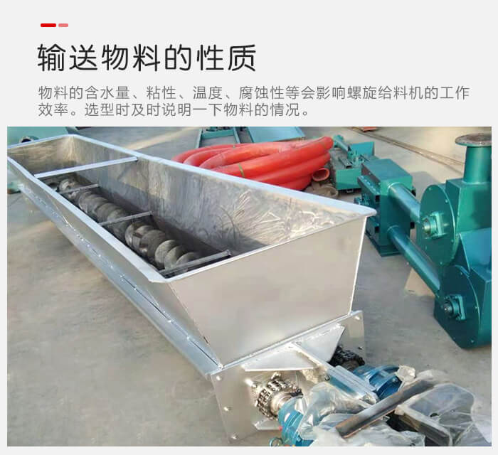 物料的含水量、粘性、温度、腐蚀性等会影响螺旋给料机的工作效率,举例来说,如含水量大,粘性强的物料在输送过程中比较容易粘连在螺旋叶片上,会出现结块现象,这样会大大削减螺旋给料机的输送效率和使用寿命,在选型的时候,用户需要事先向厂家说明一下物料的情况,以便厂家为您推荐合适的型号。