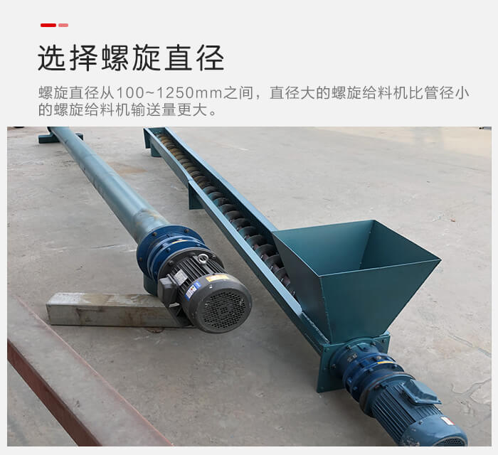 螺旋给料机螺旋直径从100~1250mm之间,选择不同的管径对于单位时间输送量是有直接的影响的,直径大的螺旋给料机比管径小的螺旋给料机输送量更大。