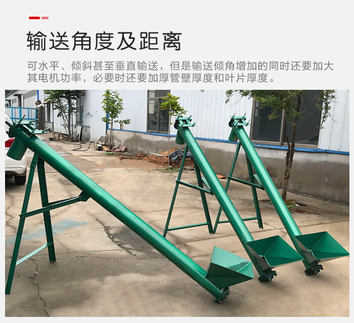 螺旋给料机可以水平、倾斜甚至垂直输送,但是输送倾角增加的同时还要加大其电机功率,必要时还要加厚管壁厚度和叶片厚度。