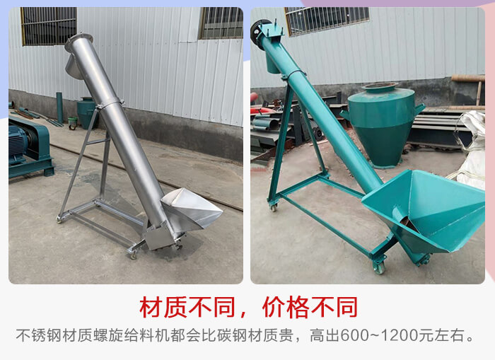 螺旋给料机可以分为碳钢和不锈钢材质两种,由于这两者材质成本有差异,碳钢螺旋给料机适合普通物料输送,不锈钢螺旋给料机主要用于输送机一些腐蚀性、高温物料,也用于食品、医药等对输送环境有卫生标准的行业,所以不锈钢材质螺旋给料机都会比碳钢材质贵,一般会高出600~1200元左右。