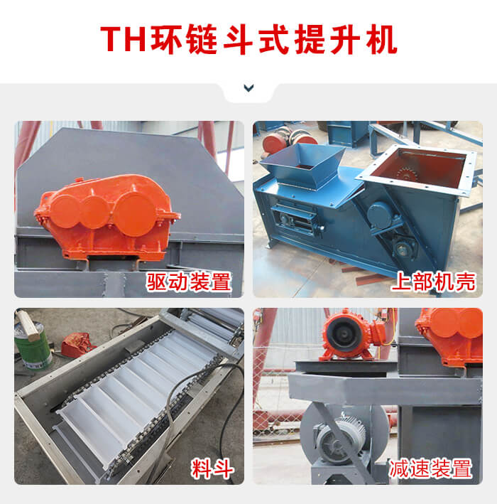 TH环链斗式提升机是一种常用的高效提升设备,提升产量大、效率高,主要由运行部件、牵引件(输送链)、驱动装置、上部装置、中部机壳、下部装置、加料口(入料口)和卸料口(出料口)组成。可适用与淀粉的高速提升输送。