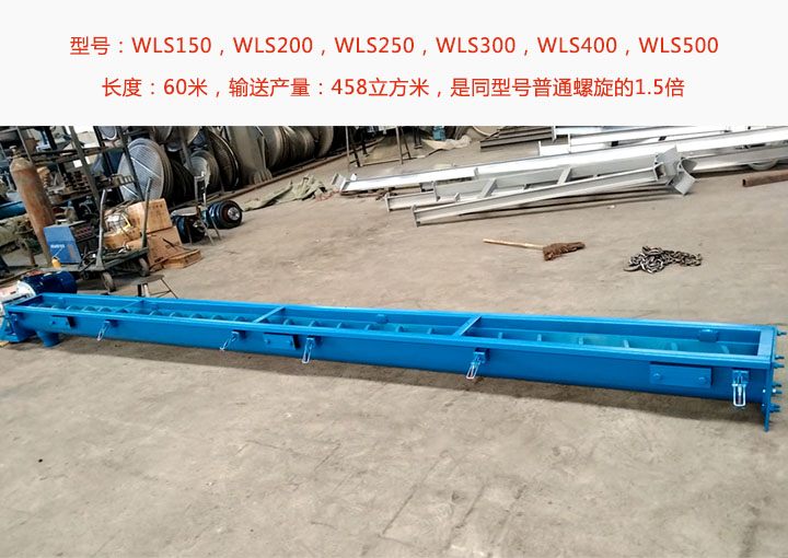 无轴午夜精品久久久久久久常规型号有WLS150,WLS200,WLS250,WLS300,WLS400,WLS500等6种规格可选,单机长度60米,输送产量高达458立方米,是同型号普通螺旋的1.5倍;可输送带状、黏稠物料、易缠绕物料;具体参数如下: