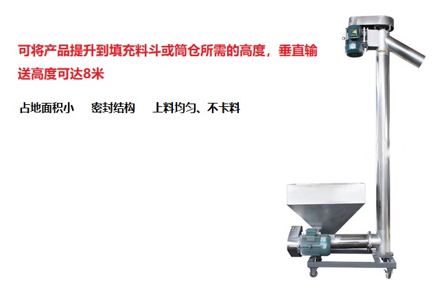 物料随螺旋高速旋转,被输送的物料从水平部分的进料口加入,通过旋转的水平进料螺杆送入输送机和垂直部分,然后将物料向上推至出料口出料口由垂直螺杆,物料随螺杆高速旋转,被输送的物料从水平部分的进料口加入,通过旋转的水平进料螺杆进入输送机,然后用垂直螺旋将物料推到出料口排出。