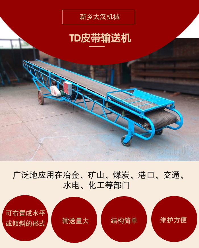 DTⅡ、TD75型皮带由于输送量大,结构简单,维护方便,成本低,通用性强等优点,而被广泛地应用在冶金、矿山、煤炭、港口、交通、水电、化工等部门,进行装车、装船、转载或堆积各种常温状态的松散密度为500~2500kg/m3各种散状物料或成件物品。由单机或多机组合成运输系统来输送物料,根据工艺要求可布置成水平或倾斜的形式,DTⅡ型皮带输送机除了可满足水平或倾斜输送要求外,还可采用带凸弧段、凹弧段与直线段组合的输送形式。输送机允许输送的物料块度取决于带宽、带速、槽角和倾角,也取决于大块物料出现的频率。该输送机适用的工作环境温度一般为-25~+40℃。我公司还生产轻型皮带输送机和移动式输送机。