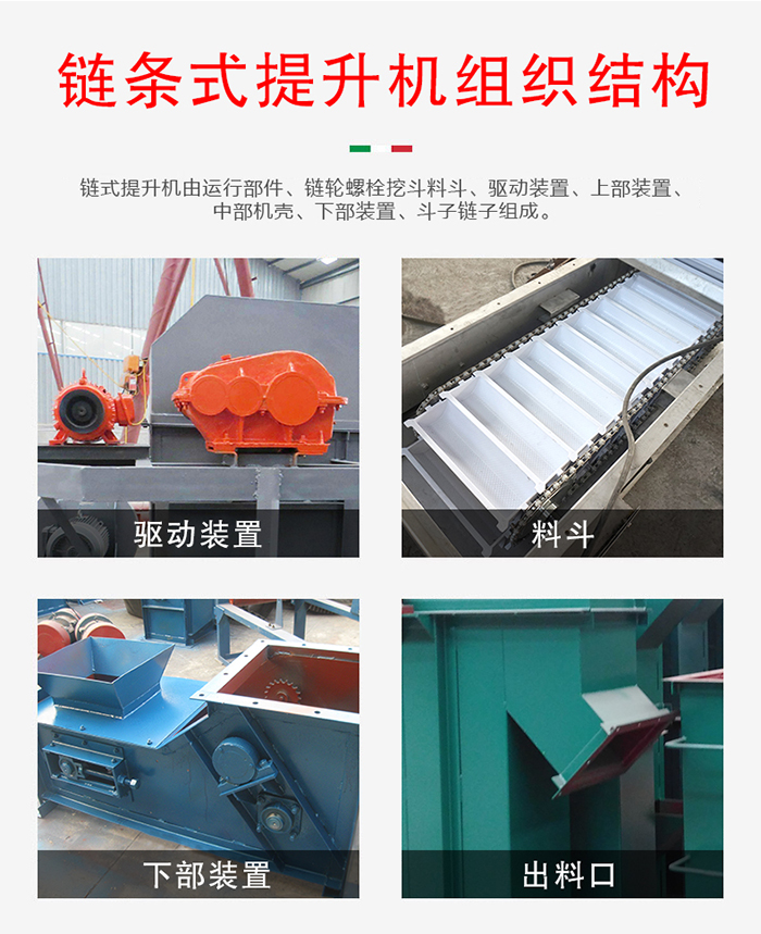 链条式提升机由运行部件、链轮螺栓挖斗料斗、驱动装置、上部装置、中部机壳、下部装置、斗子链子组成。