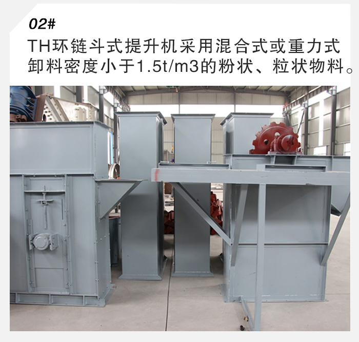 链条式提升机链条用于输送散装水泥时大多采用深型料斗。如TD型带式斗式提升机采用离心式卸料或混合卸料适用于堆积密度小于1.5t/m3的粉状、粒状的物料。TH环链斗式提升机采用混合式或重力式卸料用于输送堆积和密度小于1.5t/m3的粉状、粒状物料。