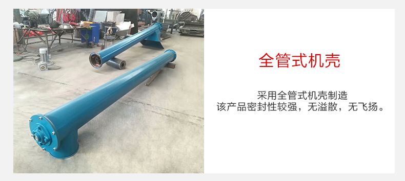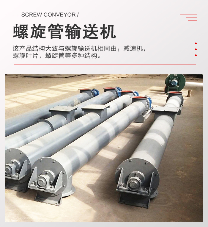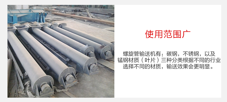 3,产品材质可供多个行业进行选择,螺旋管输送机有:碳钢,不锈钢,以及锰钢材质(叶片)三种分类根据不同的行业选择不同的材质,输送效果会更明显。