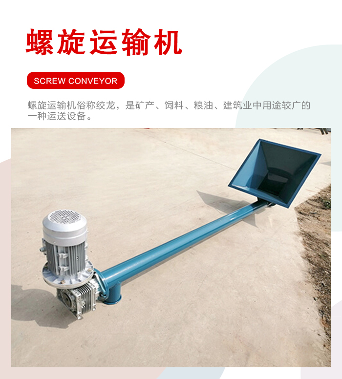 螺旋运输机俗称绞龙,是矿产、饲料、粮油、建筑业中用途较广的一种运送设备,从运送物料位移方向的角度区分,螺旋运输机分为水平式螺旋运输机和笔直式螺旋运输机两大类型,首要用于对各种粉状、颗粒状和小块状等松散物料的水平运送和笔直提高。