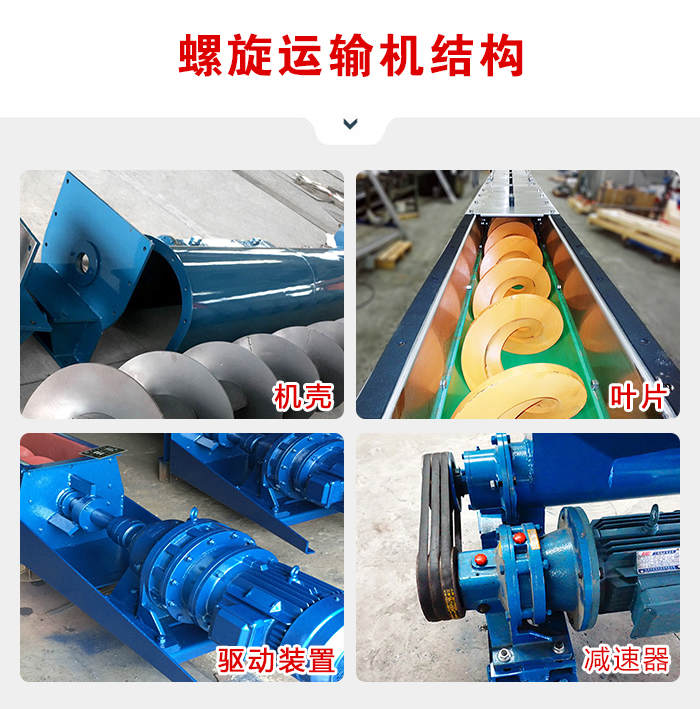 螺旋运输机一般由运送机本体、进出料口及驱动装置三大部分组成;螺旋运输机的螺旋叶片有实体螺旋面、带式螺旋面和叶片螺旋面三种方式,其中,叶片式螺旋面应用相对较少,首要用于运送粘度较大和可压缩性物料,这种螺悬面型,在完成运送作业过程中,一起具有并完成对物料的拌和、混合等功用。