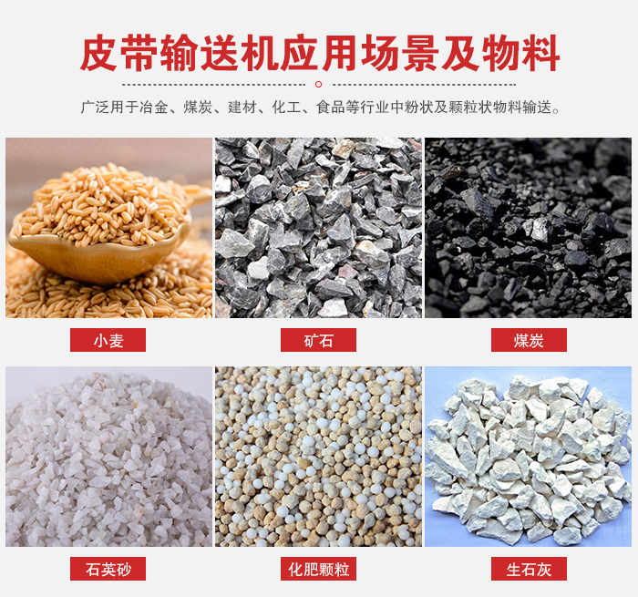 皮带输送机可用于煤炭、化工、建材、冶金、电力、轻工、粮食、港口、船舶等行业,在主要用于输送散装及成件物料,可以单台输送,也可与其他输送设备配套使用,可以水平或倾斜输送物料,适用于输送堆积密度小于1.67/吨/立方米,易于掏取的粉状、粒状、小块状的低磨琢性物料及袋装物料,如煤、碎石、砂、水泥、化肥、粮食等。被送物料温度小于60℃。对于输送有特殊要求的物料,如:高温、具有酸、碱、油类物质或有机溶剂等成份的物料,需采用特殊的输送带。