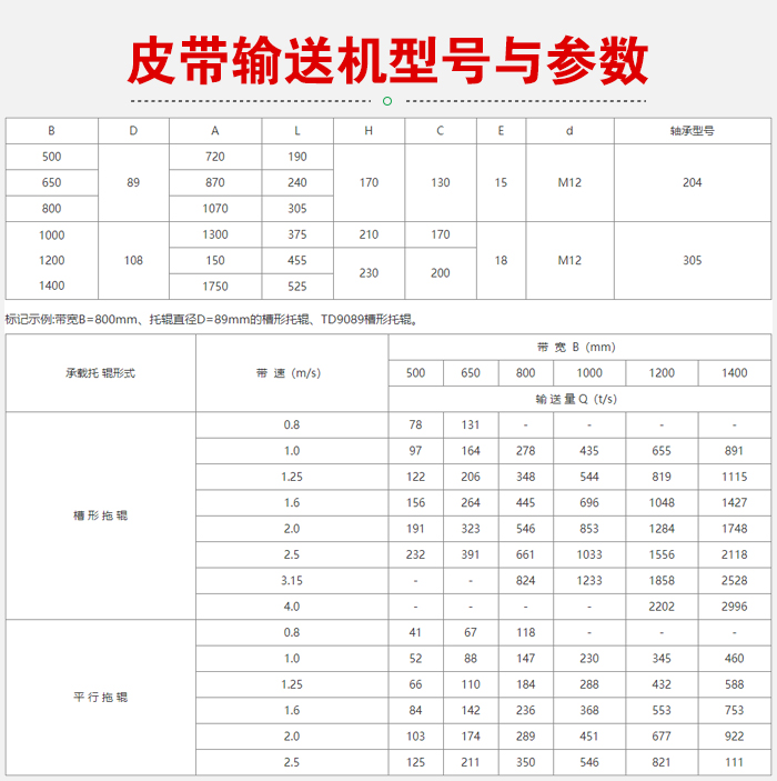 输送量大小决定型号及电机功率的选择,输送量越大的皮带输送机,应选较高的带速,型号也就越大。