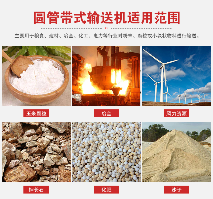 圆管带式输送机主要用于粮食、建材、冶金、化工、电力等行业对粉末、颗粒或小块状物料进行输送任务,如水泥、混凝土、饲料、化肥、粉煤灰等物料,不宜输送易变质的、粘性大的、块度大的及易结块的物料。