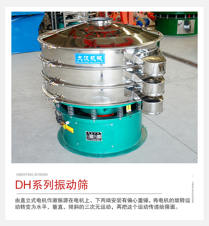 简介:DH系列振动筛是一种高精度细粉筛分机械其振动运转原理很多企业也称之为“三次元振动筛”。