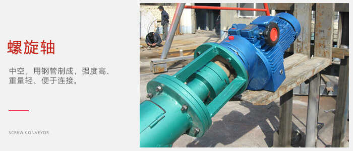 螺旋轴:中空,用钢管制成,强度高、重量轻、便于连接。在轴与轴的连接处和安装轴承处使用一小段实心轴。在连接处将实心轴伸入空心轴内用高强度的螺栓按相互垂直方向对穿空心轴与实心轴来固定连接螺旋轴。